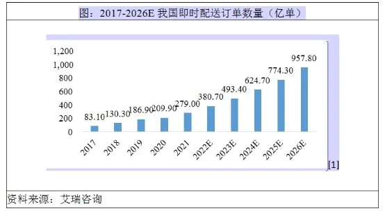 根據(jù)艾瑞咨詢《中國即時配送行業(yè)趨勢研究報告(2022年)》,2026年我國即時配送服務(wù)行業(yè)訂單規(guī)模將接近千億量級,達957.8億單,2021年-2026年復(fù)合增長率為28.0%,行業(yè)整體仍處于快速發(fā)展路線上。